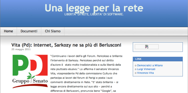 Premetto: trovo lodevoli sia i contenuti di questa ormai stagionata proposta di legge dei senatori Vita e Vimercati sia l’idea di veicolarla tramite un blog. Tuttavia, anzi, proprio per questo, trovo anche abbastanza paradossale l’abbandono al quale è stato destinato questo spazio. Come per quello dell’Intergruppo Parlamentare 2.0 (ne parlavo qui e da allora non si è mosso nulla), aprire un blog per farne in pochi mesi una mera cartolina dei tempi che furono è veramente triste. Viene quasi da pensare che l’apertura fosse dettata da ragioni di propaganda, come tutte le volte che gran parte della nostra classe dirigente si mette a sbandierare la sua presenza online che, appunto, è una mera presenza, direi quasi un presenzialismo, il quale non fa i conti con le logiche della Rete ma riproduce in essa le modalità televisive o peggio ancora dei comizi di piazza. Arrivando a questi paradossi come l’abbandono uno spazio online.